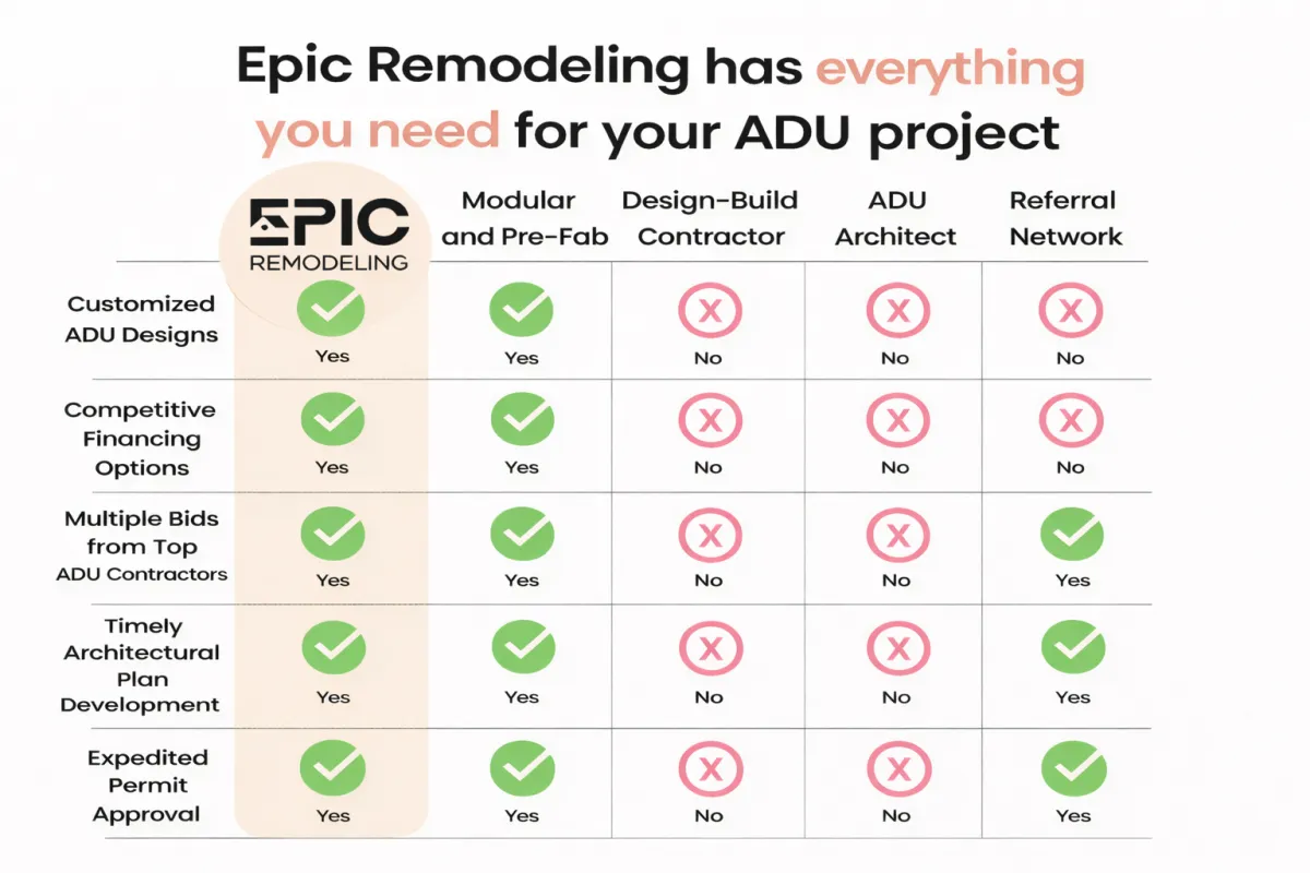 Identifying and hiring quality contractors can be tricky. But the Epic Remodeling Builder Network matches you with pre-vetted ADU contractors who you can trust for superior pricing, experience, quality, and communication.